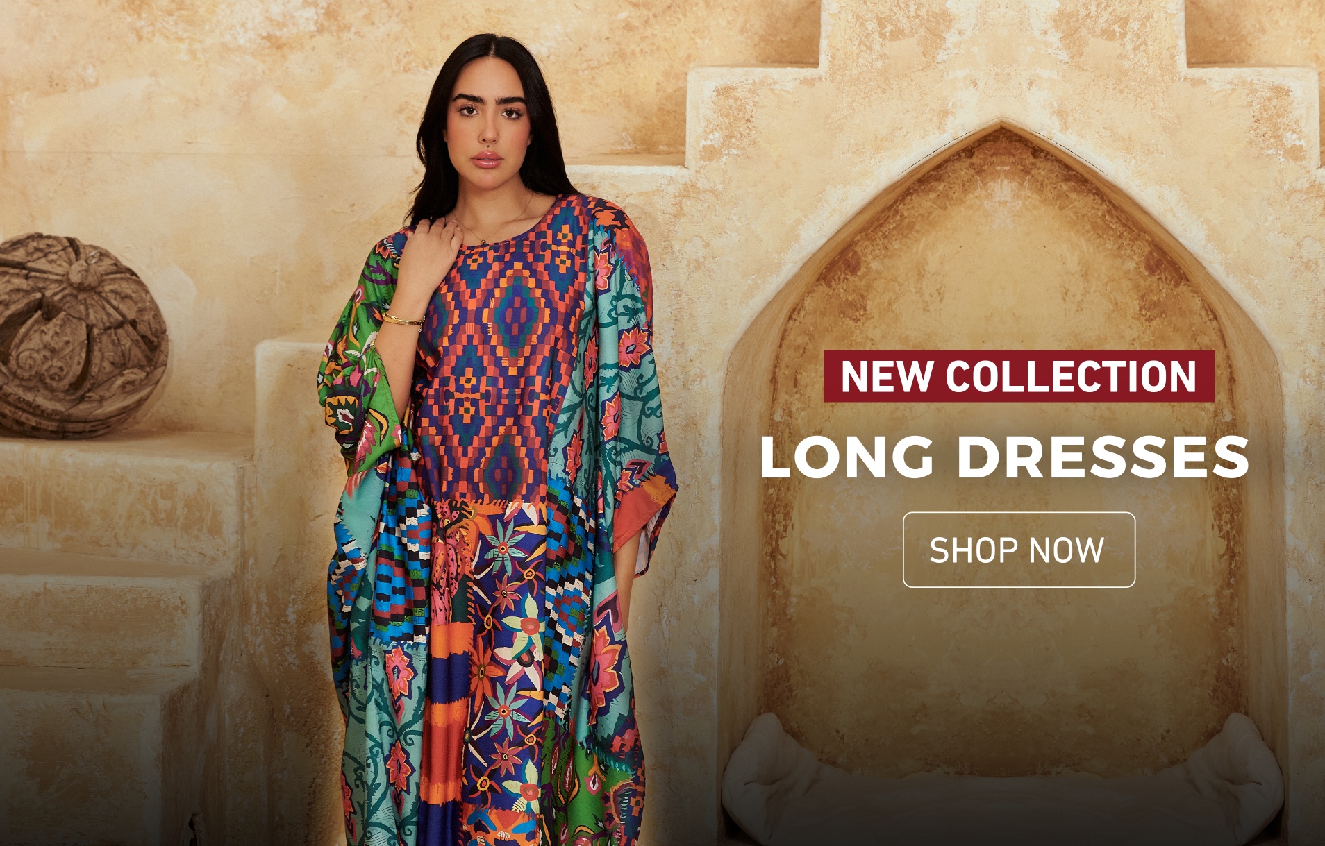 Long cotton dress with a modern and elegant design.Adorned with vibrant patterns in blue, pink, and orange hues.Features wide, long sleeves for a comf..