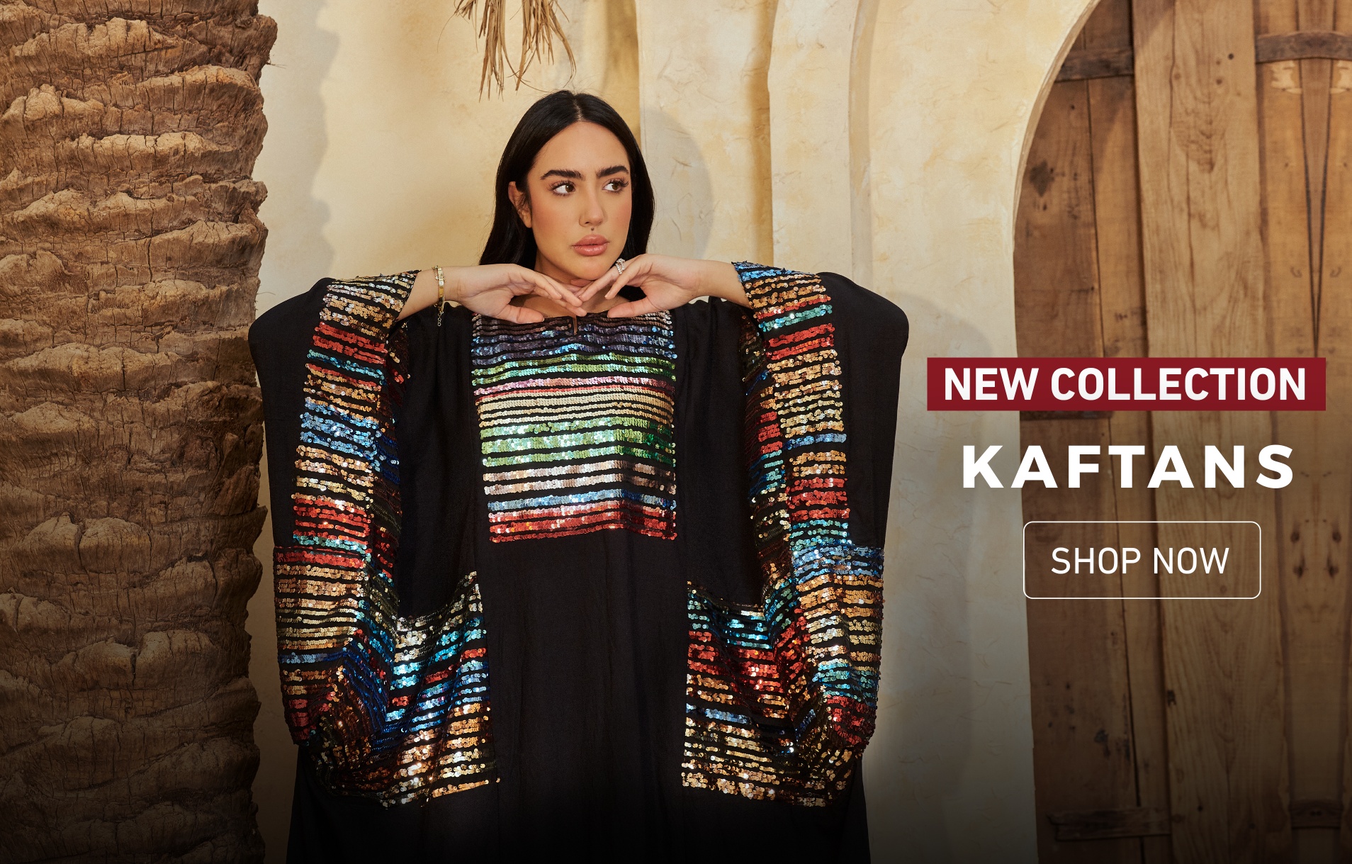 Luxurious caftan by Qomrah designed for those who appreciate elegance and comfort. This exquisite piece features a soft beige upper with a regal black..
